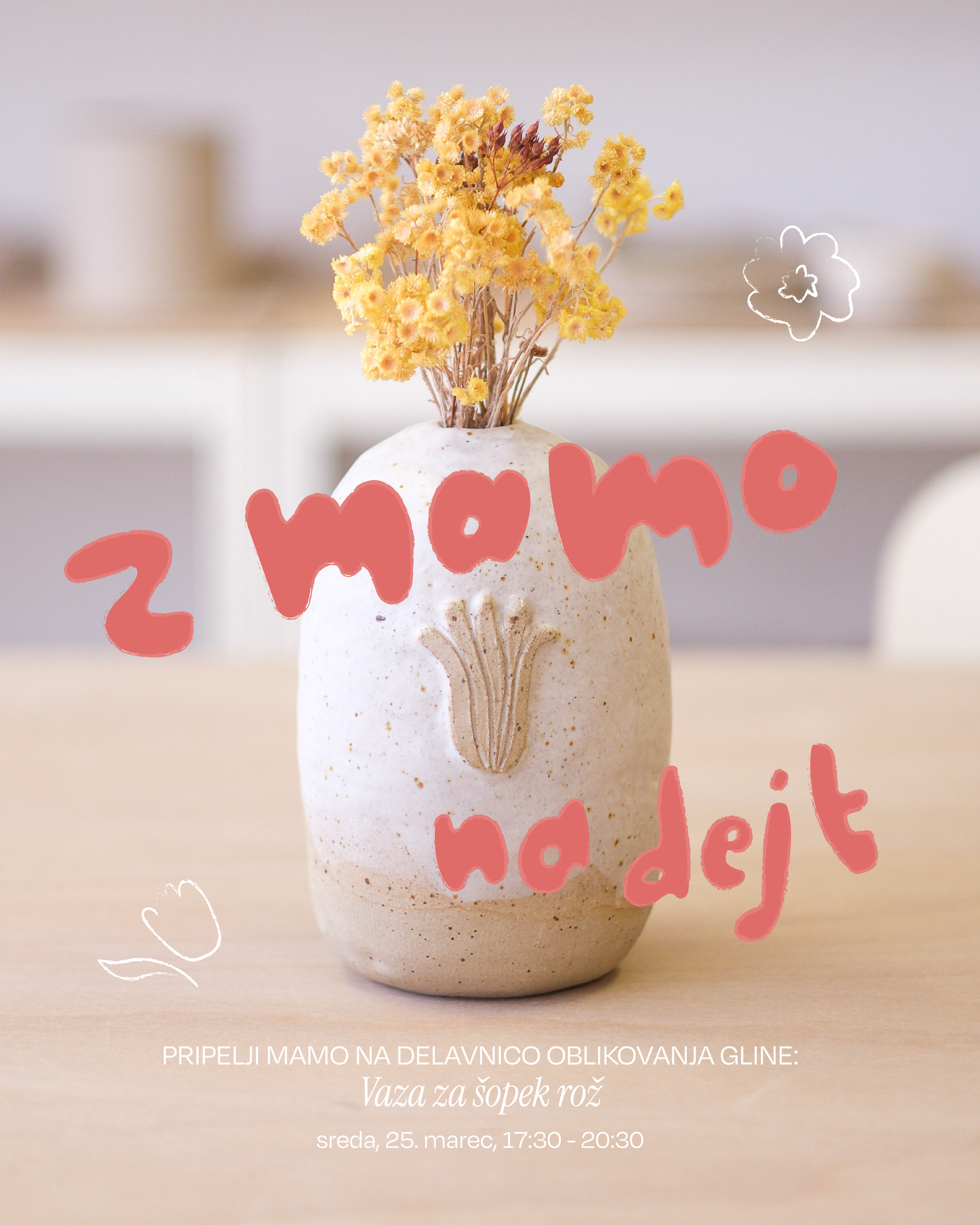 Vabimo sinove in hčere ter njihove mame na čudovit dogodek, namenjen prisotnemu preživljanju skupnega časa. Z rokami, zakopanimi v glino, bomo ustvarili vsak svojo vazo, ki bo lep spomin na skupno druženje, pa tudi uporaben dekorativni kos za vaše domove.